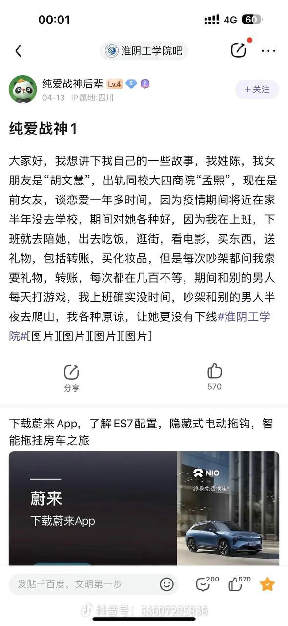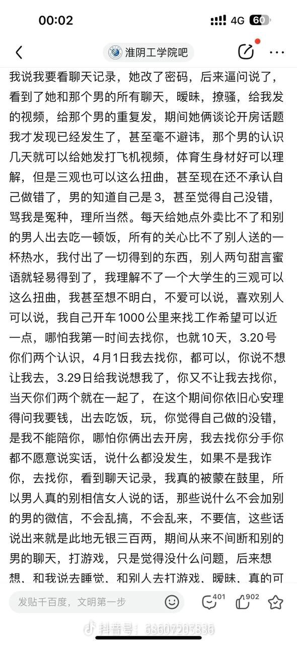 男主在外务工供女友上大学,女友胡文惠却出轨同校大四体育生孟熙 ,只因孟熙给她发了一则打飞机的视频,于是欣然前往酒店开房出轨!孟熙从此被人惯称 “飞机哥”。